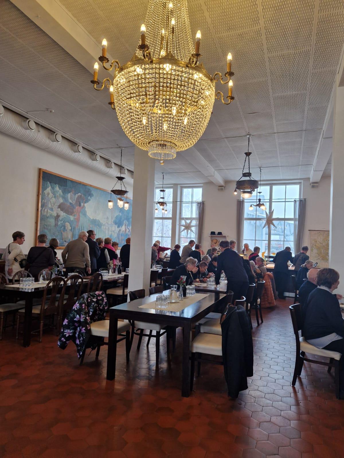 Ennen teatteriesitystä kävimme ruokailemassa ravintola Kaks Ruusussa kristallikruunujen alla ja samalla saimme kuulla Pekka Kinnusen kertomana Kaks Ruusun mielenkiintoisesta historiasta.