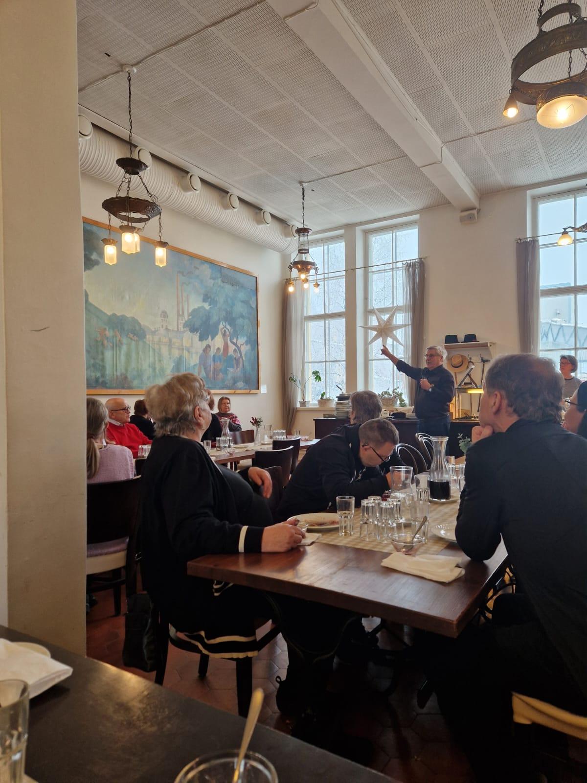 Tilaisuuden alussa Martti Kähkönen puhui kattavasi, vitseillä höystäen sukunsa tarinaa ja siitä kuinka kovalla työllä on päästy matkailutoiminnan alkuun. Puheen jälkeen saimme nauttia karjalanpaistia kaikkine lisukkeineen, unohtamatta vanhaan leipäjuureen tehtyä ruisleipää. Palan painikkeeksi joimme laskiaispullakahvit ja nautimme korkeatasoisesta haitarimusiikista.